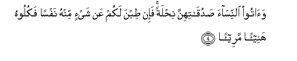 4. Waatoo alnnisaa saduqatihinna nihlatan fa-in tibna lakum AAan shay-in minhu nafsan fakuloohu hanee-an maree-an