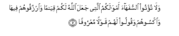 5. Wala tu/too alssufahaa amwalakumu allatee jaAAala Allahu lakum qiyaman waorzuqoohum feeha waoksoohum waqooloo lahum qawlan maAAroofan