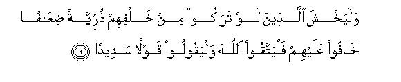 9. Walyakhsha allatheena law tarakoo min khalfihim thurriyyatan diAAafan khafoo AAalayhim falyattaqoo Allaha walyaqooloo qawlan sadeedan