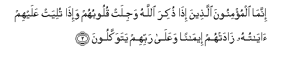 2. Innama almu/minoona allatheena itha thukira Allahu wajilat quloobuhum wa-itha tuliyat AAalayhim ayatuhu zadat-hum eemanan waAAala rabbihim yatawakkaloona