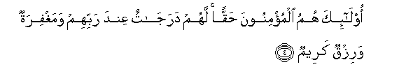 4. Ola-ika humu almu/minoona haqqan lahum darajatun AAinda rabbihim wamaghfiratun warizqun kareemun