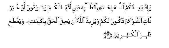 7. Wa-ith yaAAidukumu Allahu ihda altta-ifatayni annaha lakum watawaddoona anna ghayra thati alshshawkati takoonu lakum wayureedu Allahu an yuhiqqa alhaqqa bikalimatihi wayaqtaAAa dabira alkafireena