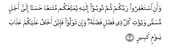 3. Waani istaghfiroo rabbakum thumma tooboo ilayhi yumattiAAkum mataAAan hasanan ila ajalin musamman wayu/ti kulla thee fadlin fadlahu wa-in tawallaw fa-inee akhafu AAalaykum AAathaba yawmin kabeerin