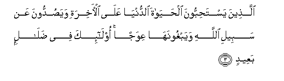 3. Allatheena yastahibboona alhayata alddunya AAala al-akhirati wayasuddoona AAan sabeeli Allahi wayabghoonaha AAiwajan ola-ika fee dalalin baAAeedin