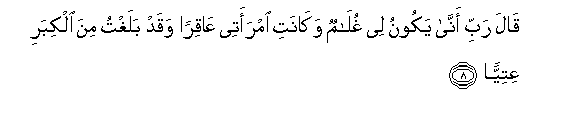 8. Qala rabbi anna yakoonu lee ghulamun wakanati imraatee AAaqiran waqad balaghtu mina alkibari AAitiyyan