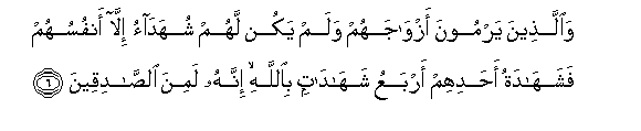 6. Waallatheena yarmoona azwajahum walam yakun lahum shuhadao illa anfusuhum fashahadatu ahadihim arbaAAu shahadatin biAllahi innahu lamina alssadiqeena