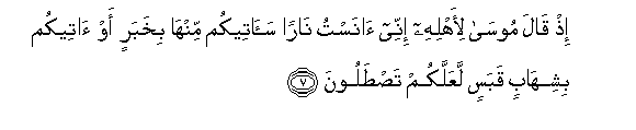 7. Ith qala moosa li-ahlihi innee anastu naran saateekum minha bikhabarin aw ateekum bishihabin qabasin laAAallakum tastaloona