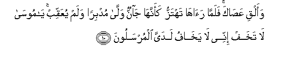 10. Waalqi AAasaka falamma raaha tahtazzu kaannaha jannun walla mudbiran walam yuAAaqqib ya moosa la takhaf innee la yakhafu ladayya almursaloona