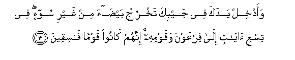 12. Waadkhil yadaka fee jaybika takhruj baydaa min ghayri soo-in fee tisAAi ayatin ila firAAawna waqawmihi innahum kanoo qawman fasiqeena