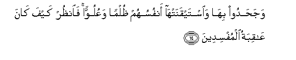 14. Wajahadoo biha waistayqanat-ha anfusuhum thulman waAAuluwwan faonthur kayfa kana AAaqibatu almufsideena