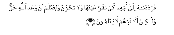 13. Faradadnahu ila ommihi kay taqarra AAaynuha wala tahzana walitaAAlama anna waAAda Allahi haqqun walakinna aktharahum la yaAAlamoona