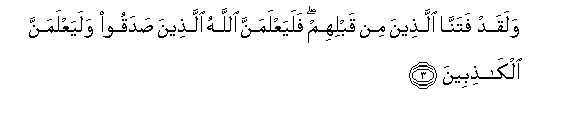 3. Walaqad fatanna allatheena min qablihim falayaAAlamanna Allahu allatheena sadaqoo walayaAAlamanna alkathibeena