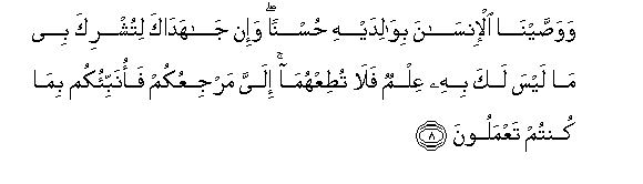 8. Wawassayna al-insana biwalidayhi husnan wa-in jahadaka litushrika bee ma laysa laka bihi AAilmun fala tutiAAhuma ilayya marjiAAukum faonabbi-okum bima kuntum taAAmaloona