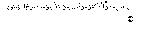 4. Fee bidAAi sineena lillahi al-amru min qablu wamin baAAdu wayawma-ithin yafrahu almu/minoona