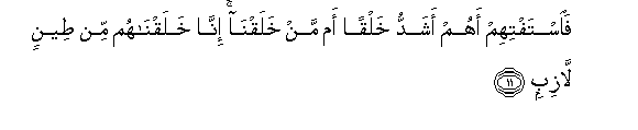 11. Faistaftihim ahum ashaddu khalqan am man khalaqna inna khalaqnahum min teenin lazibin