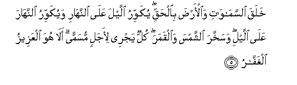 5. Khalaqa alssamawati waal-arda bialhaqqi yukawwiru allayla AAala alnnahari wayukawwiru alnnahara AAala allayli wasakhkhara alshshamsa waalqamara kullun yajree li-ajalin musamman ala huwa alAAazeezu alghaffaru