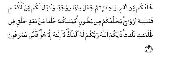 6. Khalaqakum min nafsin wahidatin thumma jaAAala minha zawjaha waanzala lakum mina al-anAAami thamaniyata azwajin yakhluqukum fee butooni ommahatikum khalqan min baAAdi khalqin fee thulumatin thalathin thalikumu Allahu rabbukum lahu almulku la ilaha illa huwa faanna tusrafoona