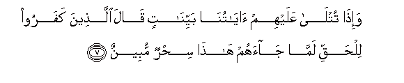 7. Wa-itha tutla AAalayhim ayatuna bayyinatin qala allatheena kafaroo lilhaqqi lamma jaahum hatha sihrun mubeenun