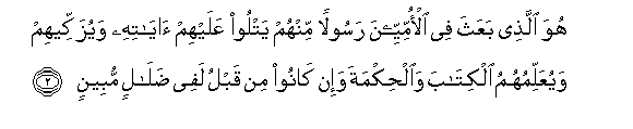 2. Huwa allathee baAAatha fee al-ommiyyeena rasoolan minhum yatloo AAalayhim ayatihi wayuzakkeehim wayuAAallimuhumu alkitaba waalhikmata wa-in kanoo min qablu lafee dalalin mubeenin