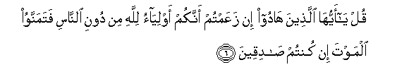 6. Qul ya ayyuha allatheena hadoo in zaAAamtum annakum awliyao lillahi min dooni alnnasi fatamannawoo almawta in kuntum sadiqeena