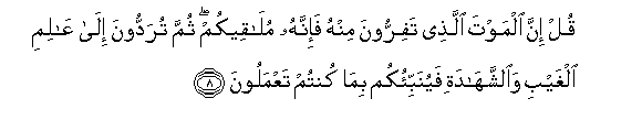 8. Qul inna almawta allathee tafirroona minhu fa-innahu mulaqeekum thumma turaddoona ila AAalimi alghaybi waalshshahadati fayunabbi-okum bima kuntum taAAmaloona