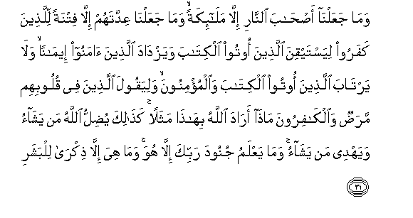 31. Wama jaAAalna as-haba alnnari illa mala-ikatan wama jaAAalna AAiddatahum illa fitnatan lillatheena kafaroo liyastayqina allatheena ootoo alkitaba wayazdada allatheena amanoo eemanan wala yartaba allatheena ootoo alkitaba waalmu/minoona waliyaqoola allatheena fee quloobihim maradun waalkafiroona matha arada Allahu bihatha mathalan kathalika yudillu Allahu man yashao wayahdee man yashao wama yaAAlamu junooda rabbika illa huwa wama hiya illa thikra lilbashari