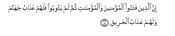 10. Inna allatheena fatanoo almu/mineena waalmu/minati thumma lam yatooboo falahum AAathabu jahannama walahum AAathabu alhareeqi